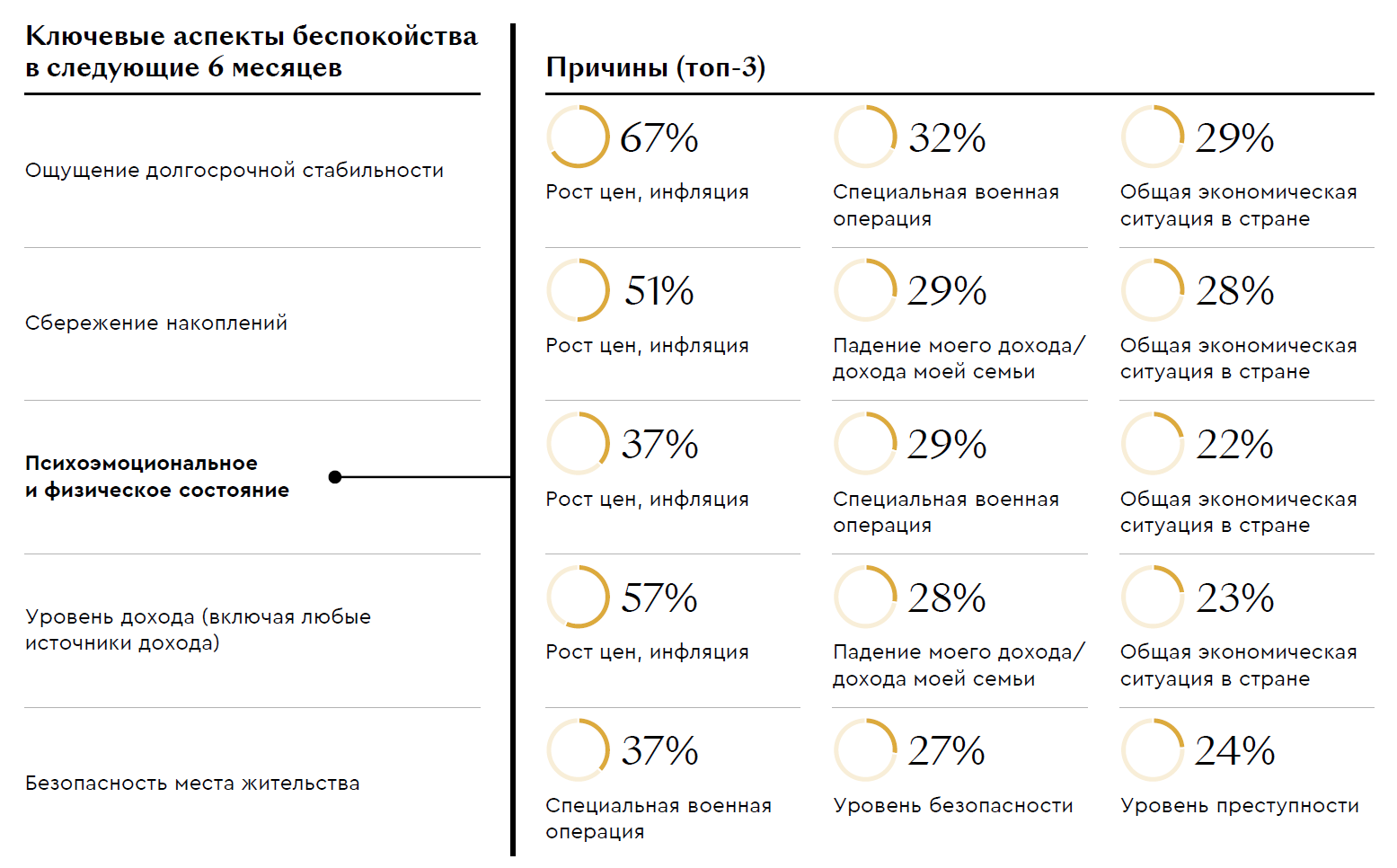 Как отмечают авторы исследования, еще одним важным изменением по сравнению с прошлым годом стало то, что потребители стали значительно меньше волноваться о своем уровне дохода (–31 п.п.) и эмоциональном и физическом состоянии (–11 п.п.) и стали беспокоиться о сохранении накоплений (+11 п.п.) и о долгосрочной стабильности (+5 п.п). Основными факторами, влияющими на уровень беспокойства, стали рост цен, СВО и общая экономическая ситуация.