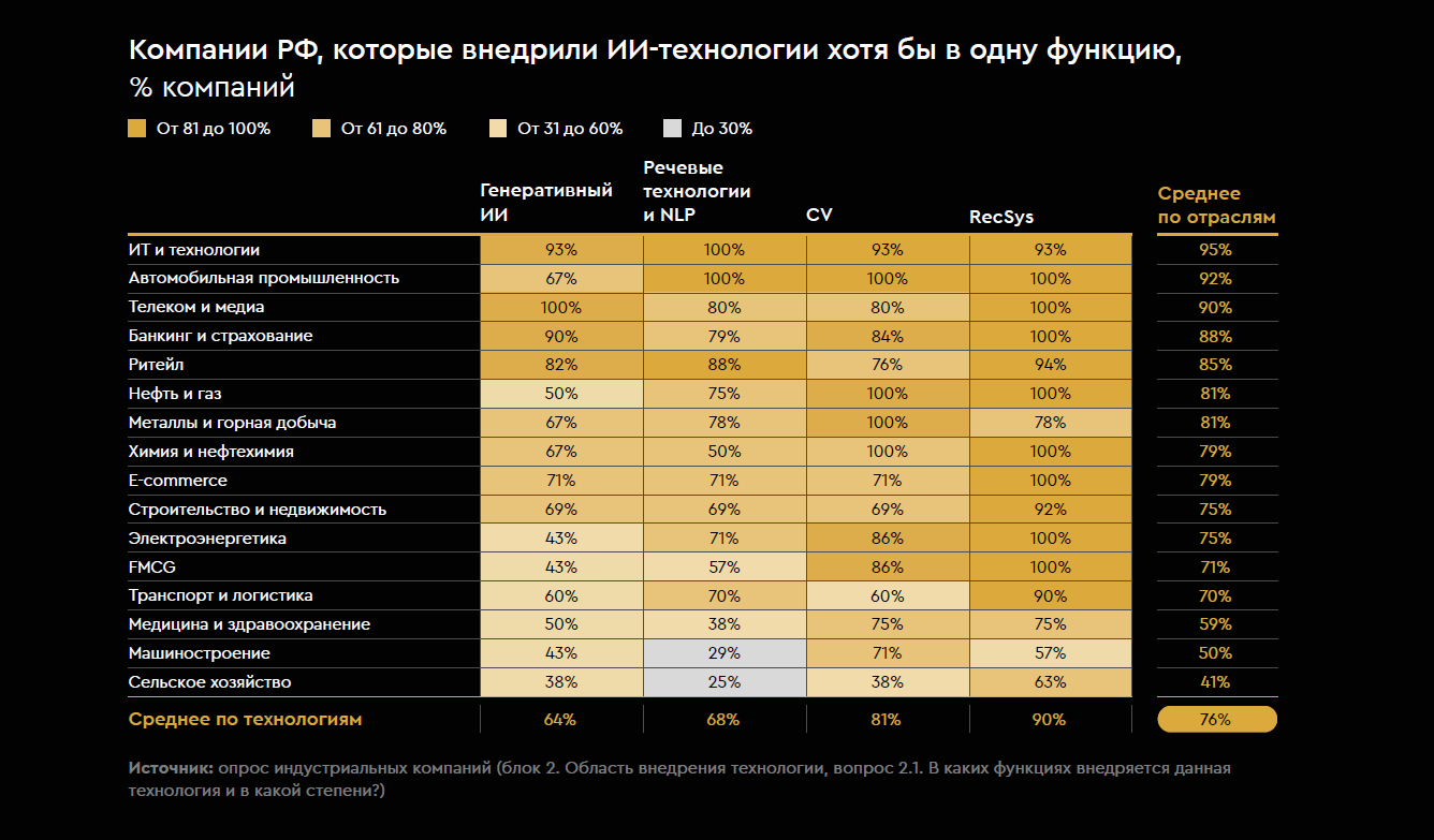 В отчете эксперты детально проанализировали четыре ключевые технологии: генеративный ИИ с акцентом на ИИ-агентах, обработку естественного языка (NLP) и речевые технологии, компьютерное зрение (CV), рекомендательные системы (RecSys). В технологическом разрезе наиболее значимый вклад вносят генеративный ИИ и компьютерное зрение, в отраслевом — наибольшая эффективность наблюдается в digital-ориентированных сферах: e-commerce, телекоммуникациях, медиа, а также в ИТ и технологиях, отмечается в отчете.