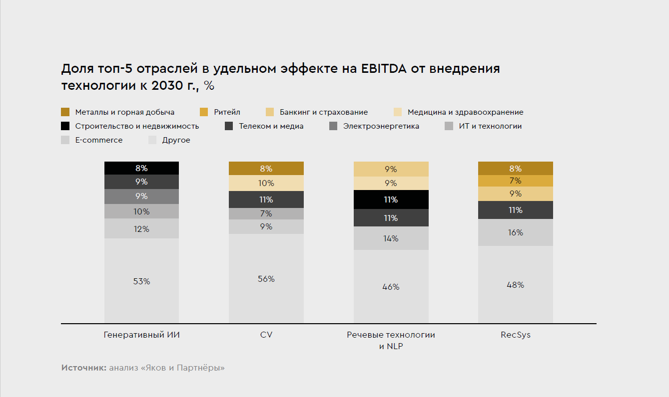 Их основная ценность — улучшение маркетинга, продаж и клиентского сервиса: 77% и 69% компаний используют их в этих областях. При этом в сфере e-commerce доля инвестиций в технологии выше средней (4,0% против 1,7%), а эффект для компаний достигает около 1% EBITDA. В ближайшие годы ожидается доработка и интеграция технологии с генеративным ИИ для создания контента, при этом традиционные алгоритмы останутся важной частью прогнозной аналитики