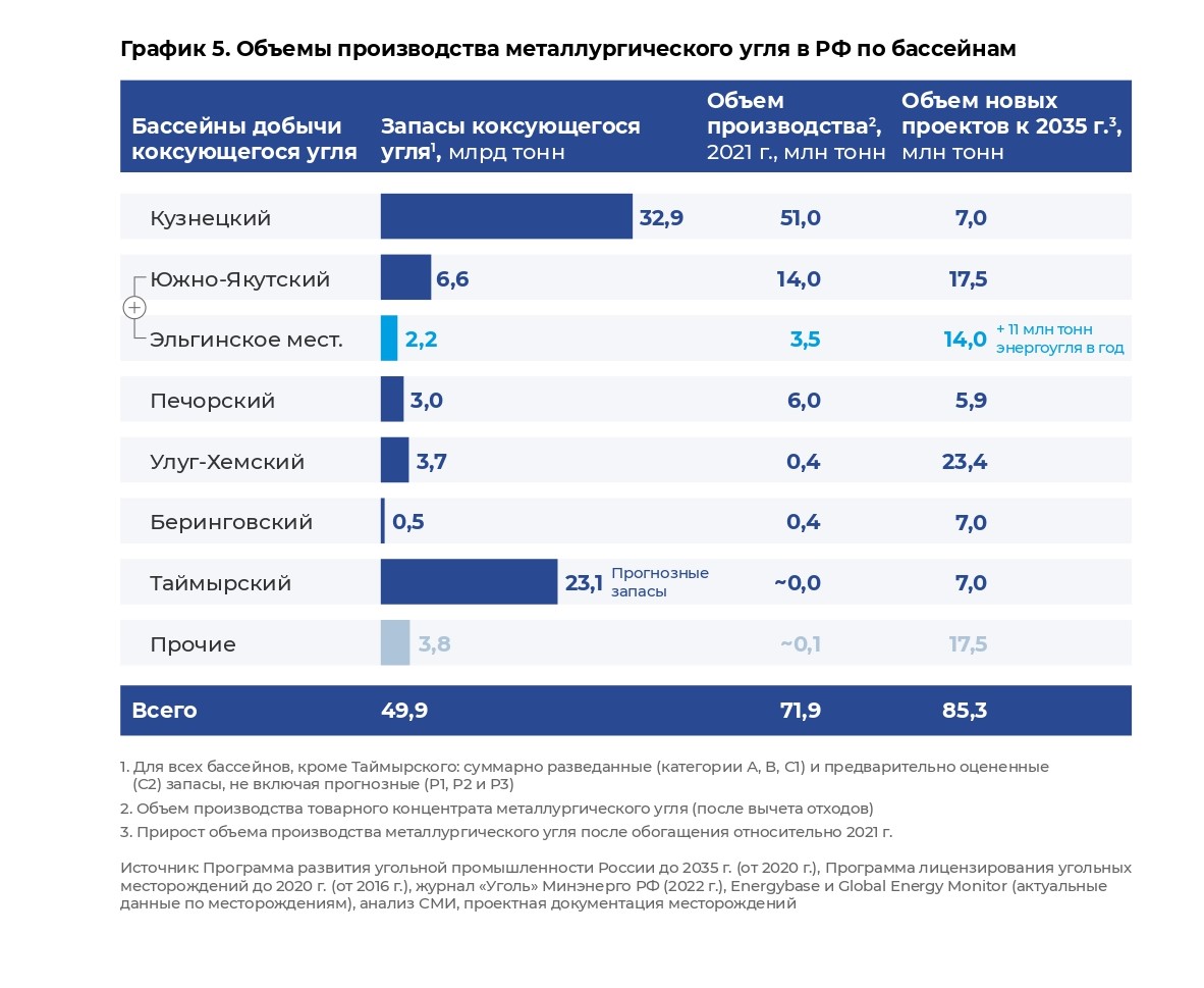 В России на протяжении многих лет уровень добычи металлургического угля остается стабильным. Его основной поставщик на внутренний рынок — Кузнецкий бассейн (74% добычи); также планируется активная разработка Улуг-Хемского бассейна и более интенсивная — крупнейшего в России Эльгинского месторождения металлургического угля, запасы (категории А, В, С1 и С2) которого ранее оценивались в 2,2 млрд тонн. Для сравнения, общие запасы четырех основных бассейнов металлургического угля (Кузнецкого, Южно- Якутского, Печорского и Улуг-Хемского) оцениваются примерно в 46 млрд тонн. Себестоимость добычи составляет 45–65 долл. за тонну. В рамках Программы развития угольной промышленности России до 2035 г. планируется запуск инвестпроектов для увеличения добычи до 100 млн тонн в год в Восточной Сибири и на Дальнем Востоке.