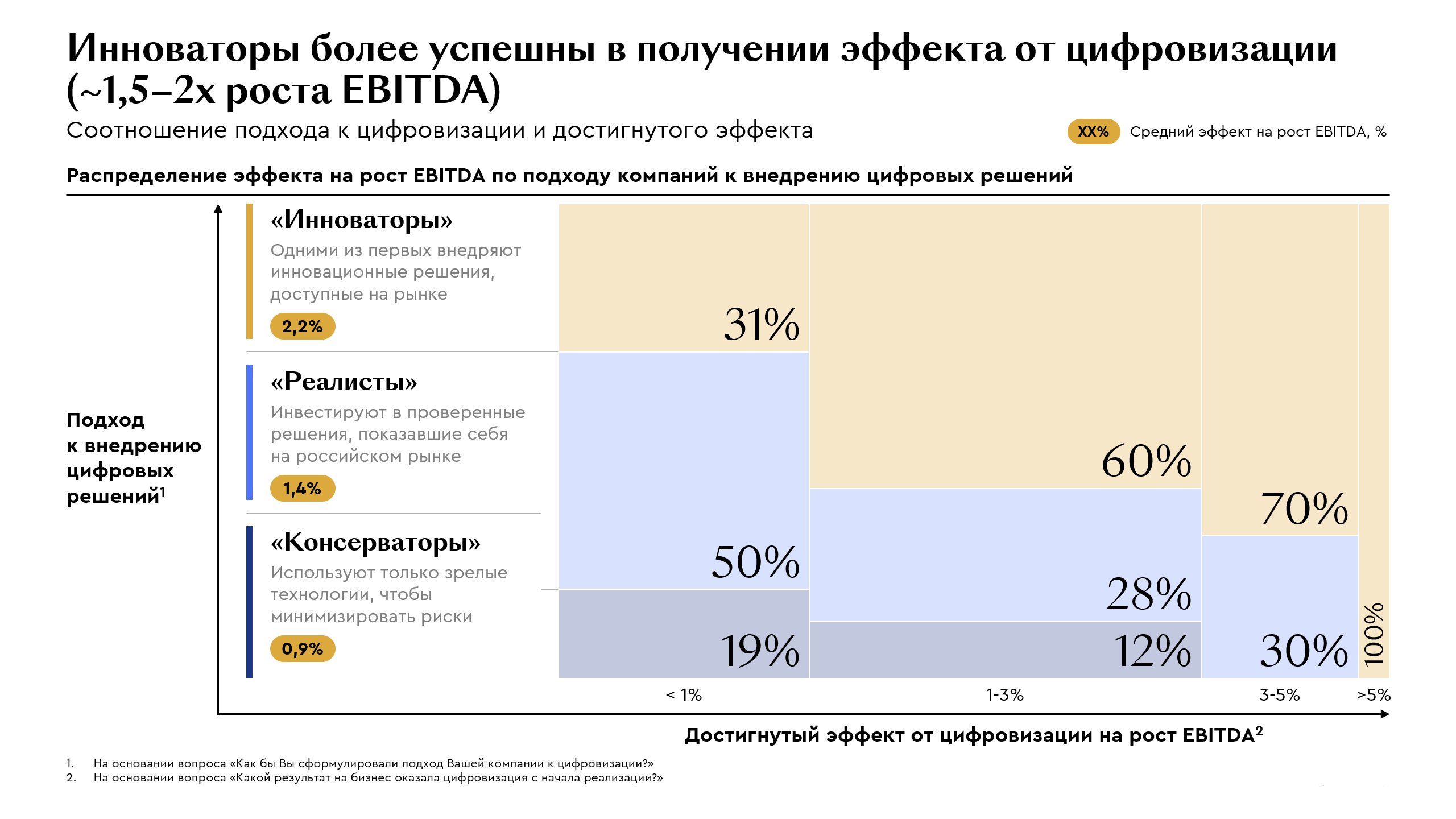 «Активность в инновациях напрямую связана с финансовыми результатами. Чем выше готовность компании экспериментировать и внедрять новые технологии, тем выше ее прибыль. Разрыв между инноваторами и консерваторами превышает двукратный уровень — 2,2% против 0,9%»