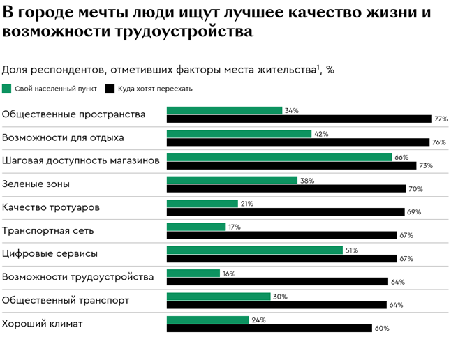 В ходе опроса респонденты отметили, что для них ключевым фактором счастья является не только экономическая составляющая, а повседневное удобство и качество городской среды. Например, более 70% опрошенных в качестве основных черт города своей мечты выделили наличие общественных пространств, зон отдыха и магазинов в шаговой доступности.