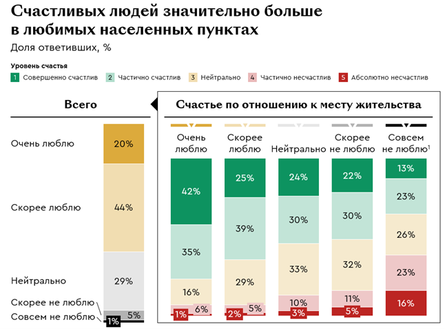 Судя по ответам респондентов, любовь к городу напрямую связана с субъективным ощущением счастья. Так, среди тех, кто любит свой город, 77% чувствуют себя счастливыми. Для сравнения: среди тех, кто не любит свое место проживания, доля счастливых лишь 36%.
